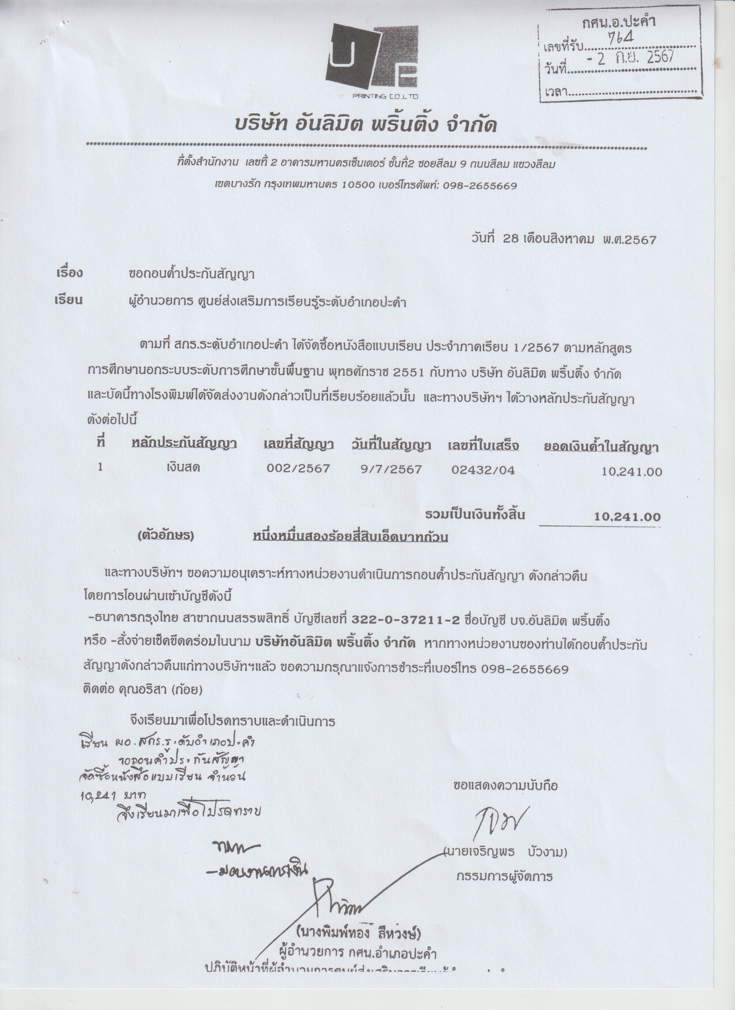 ขอถอนเงินประกันสัญญาจัดซื้อหนังสือแบบเรียน ภาคเรียนที่ 1/2567