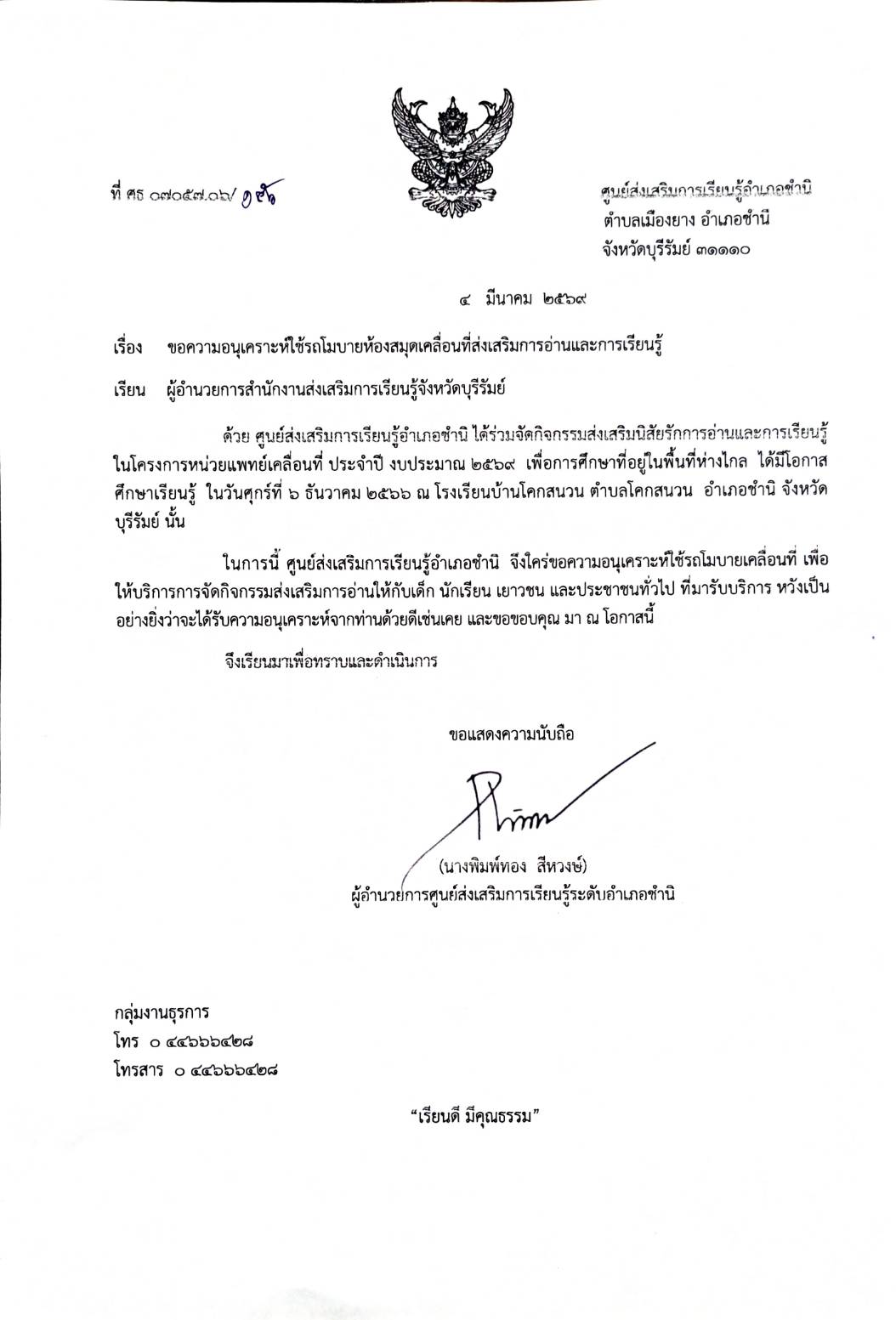 | เรื่อง | ขอความอนุเคราะห์ใช้รถโมบายห้องสมุดเคลื่อนที่ส่งเสริมการอ่านและการเรียนรู้- |